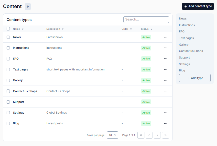 Типи контенту — це структурні шаблони, які використовуються для створення груп сторінок із подібною логікою або структурою (наприклад, новини, інструкції, FAQ, блог тощо). Кожен тип має власні SEO-налаштування, рівні доступу, поля та відображення.